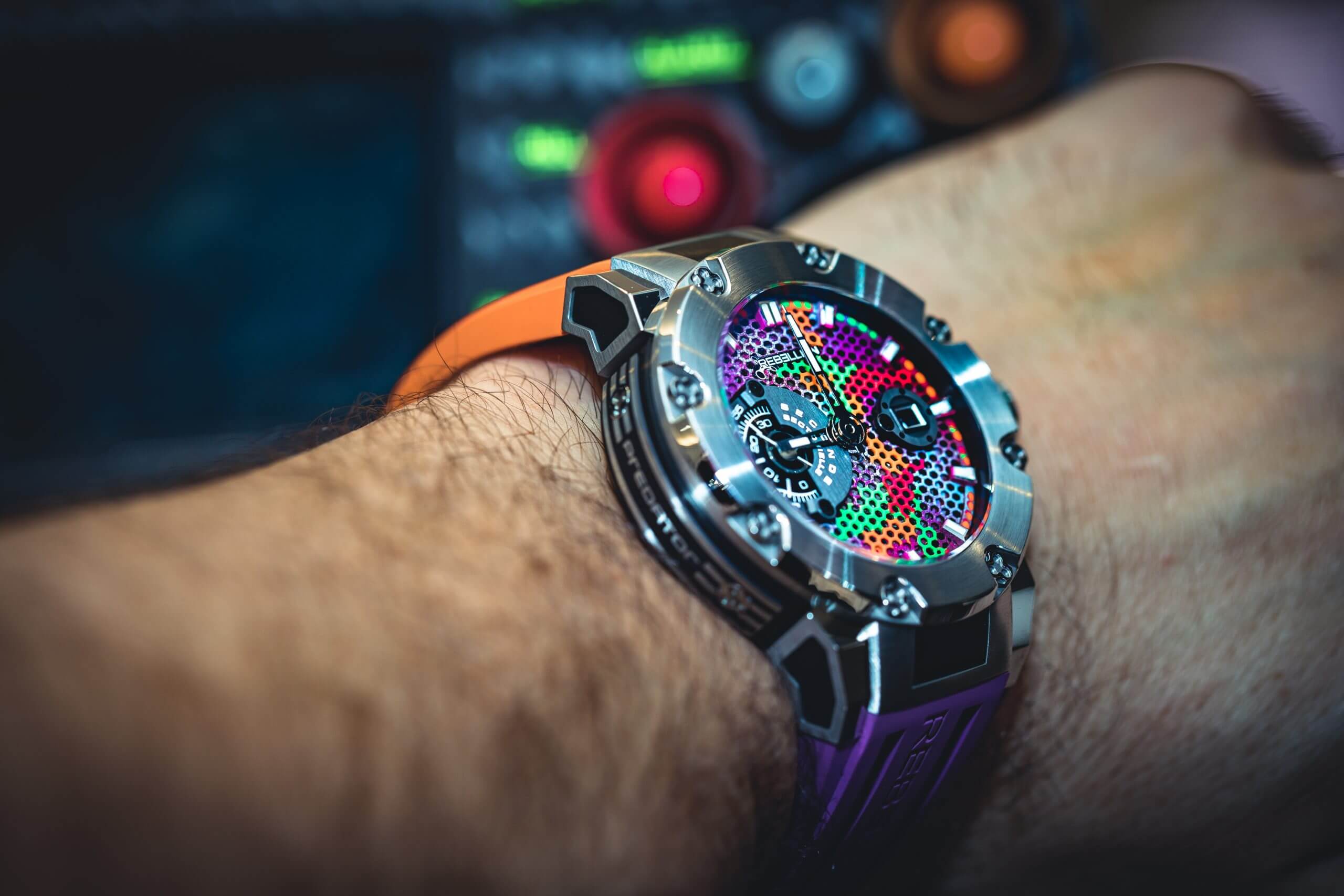 アングル、レイヤー、カーブの組み合わせが印象的なPREDATOR CHRONOGRAPHは、時計製造と自動車の美学を完璧に融合させたモデルです。ハニカム構造のダイアル、REBELLION ロゴ入りネジで固定されたベゼル、特許取得済みのDバックルなど、細部に至るまでレーシング・メカニズムを彷彿とさせるデザインが施されています。48時間のパワーリザーブとカレンダー機能を備えたこの堅牢なクロノグラフは、9時位置にあるオリジナルの秒表示が特徴的です。0秒から30秒までは短い小針が、31秒から60秒までは大きな針がリレーして動きます。